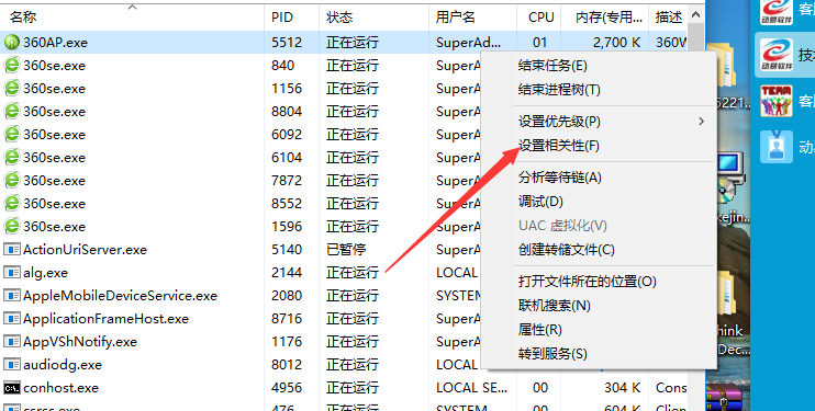 首先打开任务管理器,找到SQL服务右键选择设置相关性