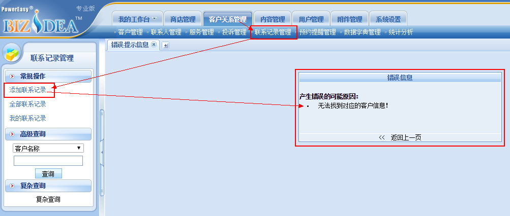 问题描述:BI系统的客户关系管理功能,在联系记录管理下面添加联系记录,会报错“无法找到对应的客户信息”。