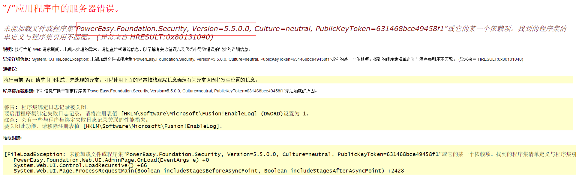 问题描述:登录后台中报错:未能加载文件或程序集“PowerEasy.Foundation.Security,Version=5.5.0.0“;