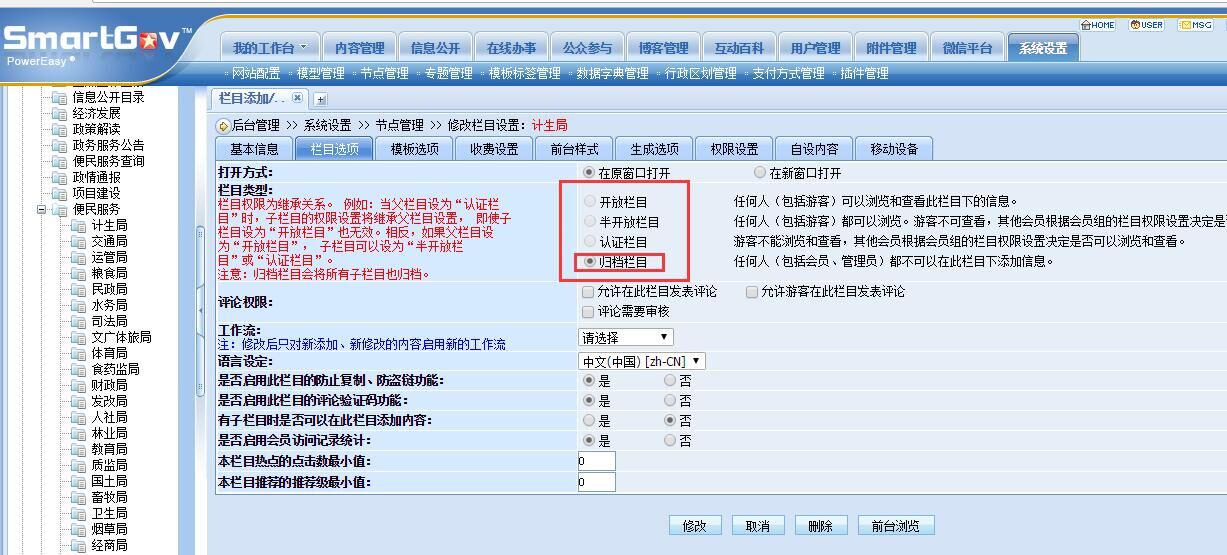 解决方案:把栏目节点开启的“归档栏目”改选成“开放栏目”、半开放栏目或认证栏目,这其他三种栏目类型都可以解决在内容管理找不到栏目节点这个问题。