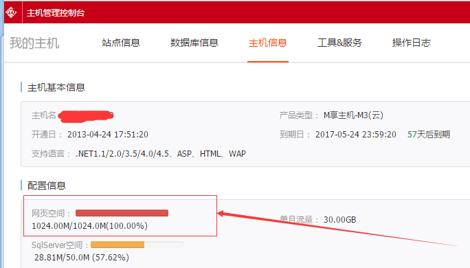 从图上我们知道,是由于存放网站文件的空间已满导致出现的错误,那么,这时候就需要去删除网页空间里面无关的文件或者增加空间。