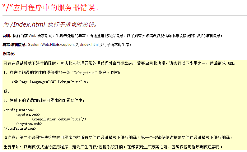 问题描述:在某些个别情况下,网站在打开时报出“为 /Index.html执行子请求时出错”,如下图所示: