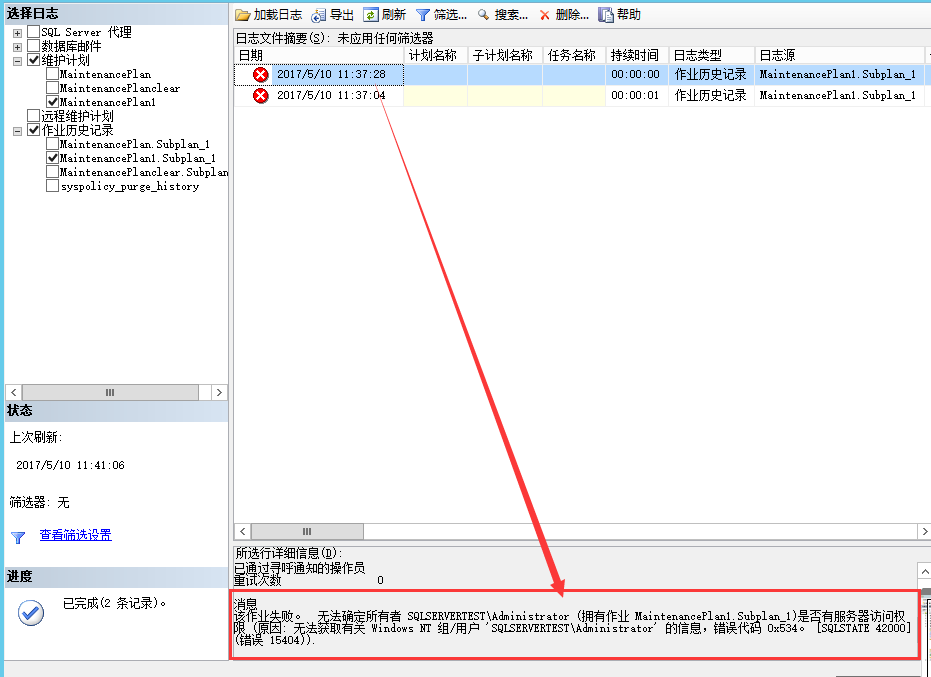 得到最终的提示: 无法确定所有者 SQLSERVERTESTAdministrator (拥有作业 MaintenancePlan1.Subplan_1)是否有服务器访问权限 (原因: 无法获取有关 Windows NT 组/用户 'SQLSERVERTESTAdministrator' 的信息,错误代码 0x534。 [SQLSTATE 42000] (错误 15404)).
