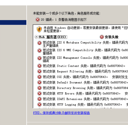 问题描述:重装IIS的时候提示“未能安装一个或多个以下角色”。