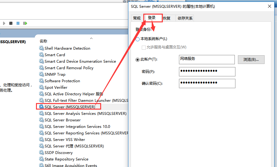 解决方案: 应用面板-管理工具-服务,在里面找到对应的SQL服务,确认登录面板下的账号。之后再重新启动,就可以了。