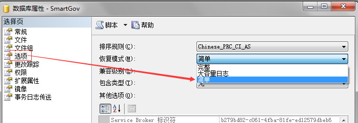 在打开数据库软件,右击smartgov数据库,点击属性,在选项中的恢复模式选择 简单模式