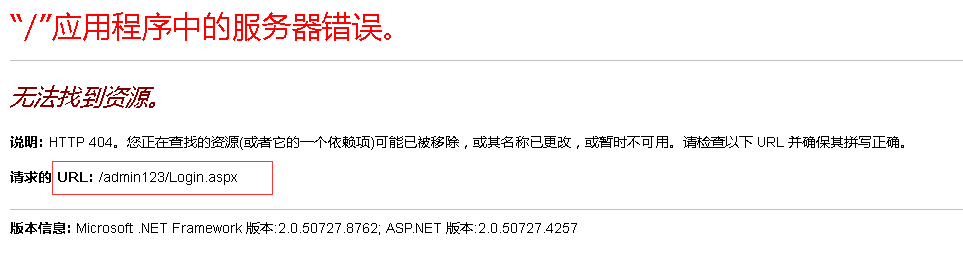1.由于我们网站目录下存在admin文件夹,然后用/admin/login.aspx登陆提示“文件未找到!”,并且login.aspx状态码为200;这种原因就是后台地址修改了,不是默认的/admin