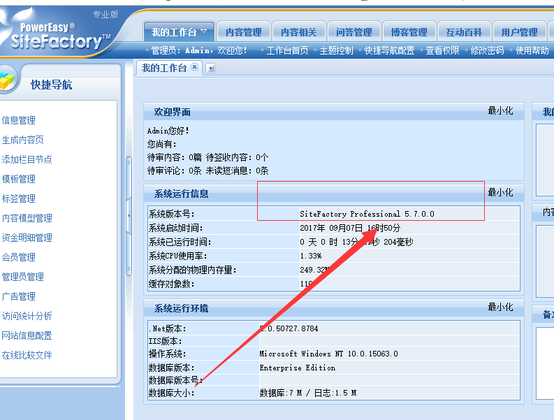 1、登陆网站后台,在后台首页(我的工作台)可查看系统名称及版本号,如图: