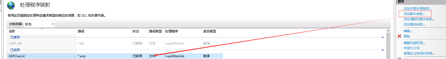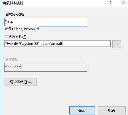 2.在处理程序映射下面添加*.asp的脚本映射(请求路径:*.asp;可执行文件:%windir%system32inetsrvasp.dll;名称:ASPClassic)