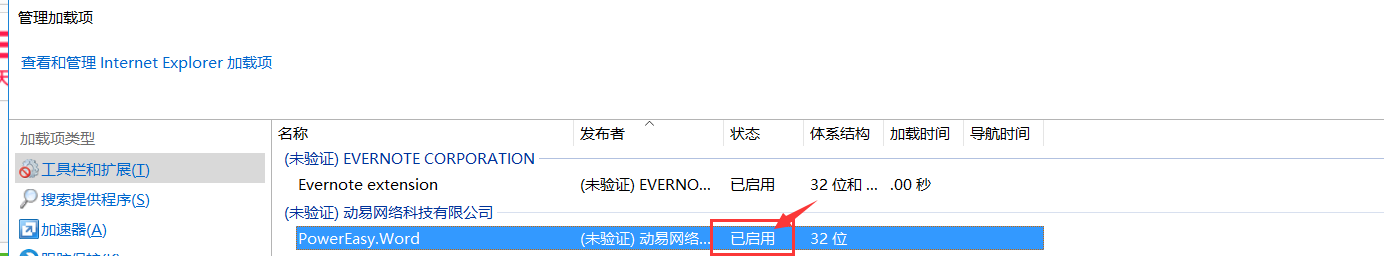 首先检查是否word上传插件是否在IE浏览器管理加载项中是已启用的状态,如下图: