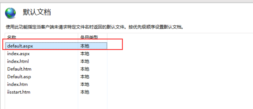 检查IIS的默认文档“Default.aspx”是否置顶,如不是则设置置顶即可,如下图: