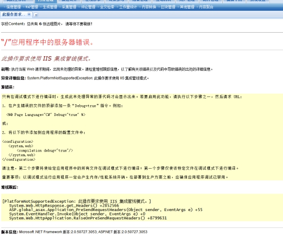 <p style="text-indent: 2em">问题:发布文章,保存后提示异常,如下图</p> <p align="center"><img alt="" border="0" height="293" src="$/History/tech/uploadfiles/2017/11/201711031345165868.jpg" width="606" /></p> <p style="text-indent: 2em">解决:根目录下web将On修改为Off,查看具体错误。将程序池又经典模式调整为集成模式。</p> <p align="center"><img alt="" border="0" height="513" src="$/History/tech/uploadfiles/2017/11/201711031345163031.jpg" width="581" /></p> <p style="text-indent: 2em"> </p>