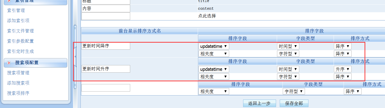 检查对应的索引搜索配置项,添加对应的“前台显示排序方式名”对应的排序字段即可,如下图: