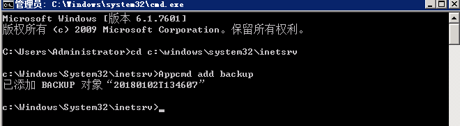 打开cmd运行 : cd c:windowssystem32inetsrv Appcmd add backup