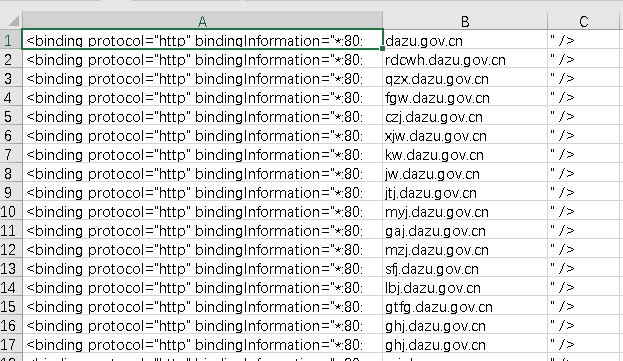 这里推荐一个简单方法:在excel中线添加好格式,然后直接复制到applicationHost.config中即可(其中A和C列是固定的,只需要修改B列):