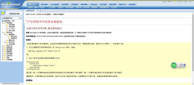 <p style="text-indent: 2em">问题:IIS应用程序中的程序错误,如下图:</p> <p align="center"><img alt="" border="0" height="290" src="$/History/tech/uploadfiles/2018/1/201801021756104135.png" width="657" /></p> <p style="text-indent: 2em">问题分析与解决办法:该问题由IIS程序是托管模式版本不同,上服务器将托管模式由经典修改为集成即可。如下图:</p> <p align="center"><img alt="" border="0" height="343" src="$/History/tech/uploadfiles/2018/1/201801021756100663.jpg" width="559" /></p>