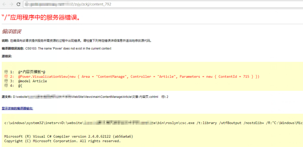 <p style="text-indent:2em;"><strong>问题:</strong>打开文章内容提示“应用程序中的服务器错误,如图</p> <p align="center"><img align="" alt="" src="$/History/tech/uploadfiles/2018/1/201801291656172674.png" style="border-width: 0px; border-style: solid; width: 800px; height: 390px;" /></p> <p style="text-indent:2em;"><strong>解决:</strong></p> <p style="text-indent:2em;">1、覆盖根目录与views目录下的web.config文件</p> <p style="text-indent:2em;">2、备份好网站文件替换 找同版本的默认安装包 替换Roslyn目录下文件</p>