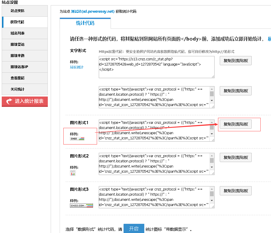 添加完成后就会进入一个统计代码的页面,选择一个合适的图片样式,然后复制那段代码粘贴到我们网站的模板底部即可