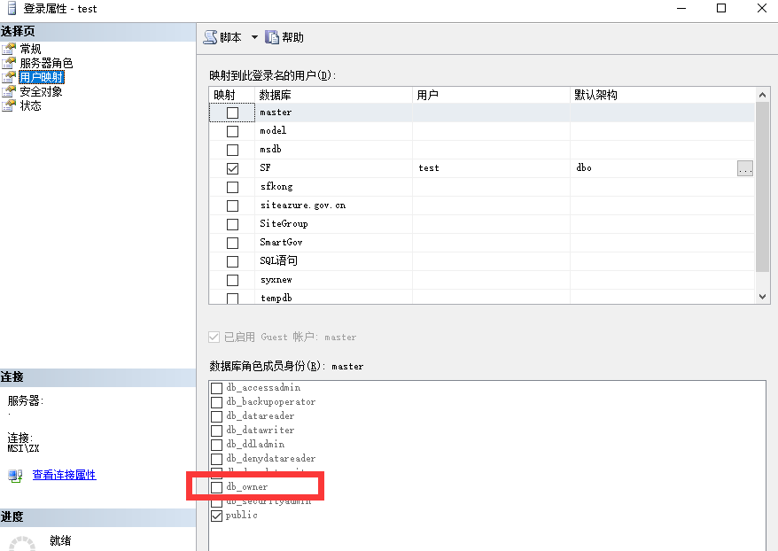 <p style="text-indent:2em;">错误如下图所示:</p> <p align="center"><img align="" alt="" border="0" height="425" src="$/History/tech/uploadfiles/help/2018/2/201802011318245714.png" width="800" /></p> <p style="text-indent:2em;">原因就是数据库登录名的用户映射没有勾选db_owner,确保用户映射中db_owner和pulic勾选即可</p> <p align="center"><img align="" alt="" border="0" height="567" src="$/History/tech/uploadfiles/help/2018/2/201802011322337353.png" width="800" /></p>
