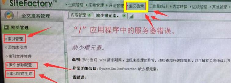 问题描述:进入后台点击全文检索,报缺少根元素错误