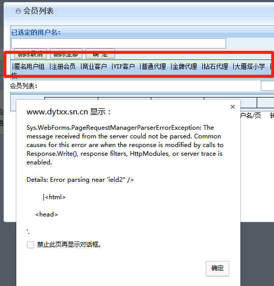 问题描述:在后台进入会员中心,打开会员列表出现parsing near 'ield2'错误。