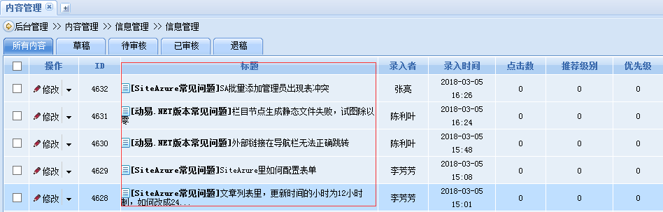 如图:siteFactory自从升级到5.9版本,增加了录入时间列,使得原来的标题列被减小,甚至出现俩列的情况,有客户反馈基于视觉问题,需要自定义调整列宽比例。