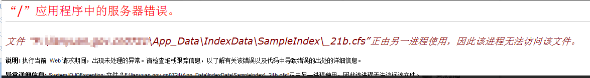 全文检索文件报错“……正由另一进程使用” 来源:本站原创 点击数: 次 发布时间:2018年03月31日 问题:前台全文检索使用搜索时候提示如下问题,应用程序中的服务器错误。 解决:检查服务器,退出安全狗 然后重启IIS 。
