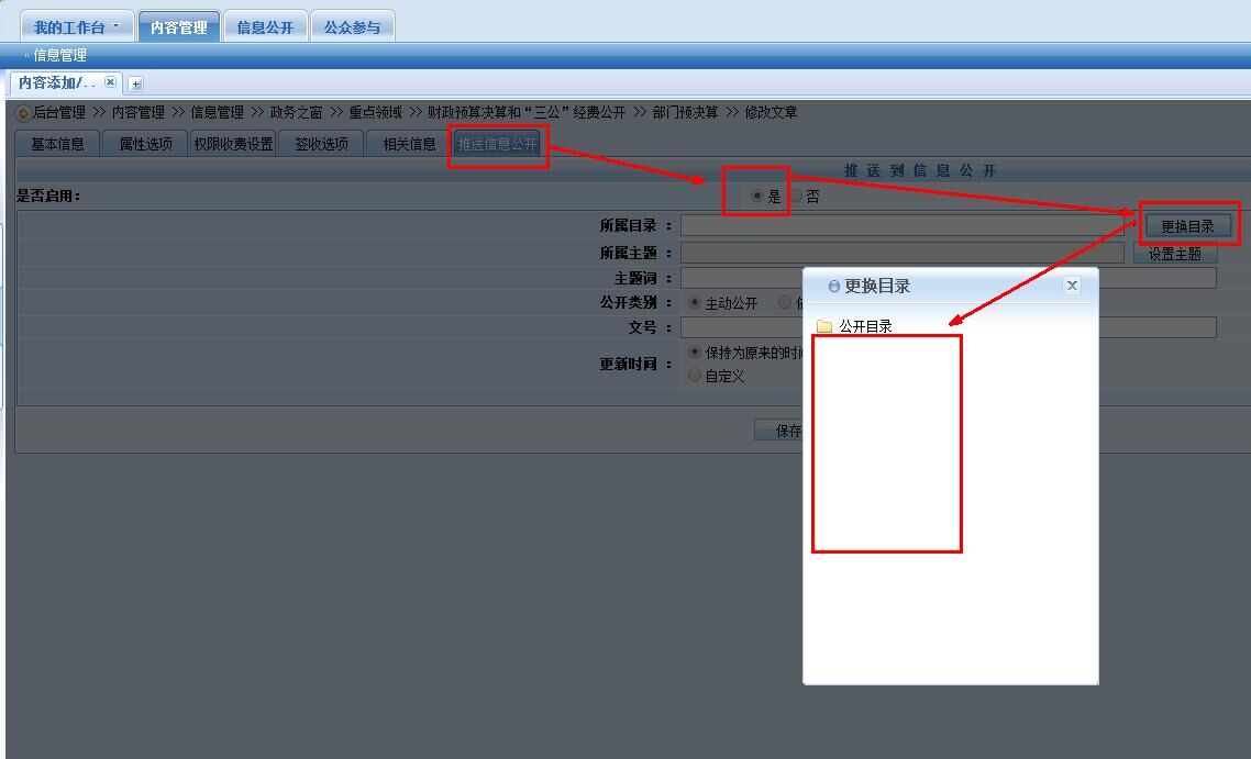 普通管理员内容管理的信息里推送到“信息公开”的信息公开目录无法指定。如下图:
