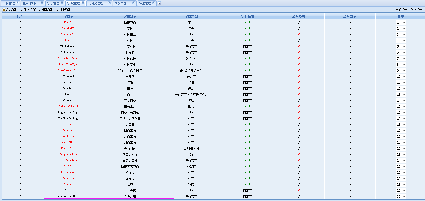 1.在模型管理中找到文章模型,添加一个“责任编辑”的单行文本(字段类型可自定义,单行文本、单选框)