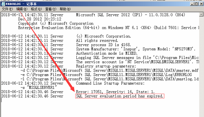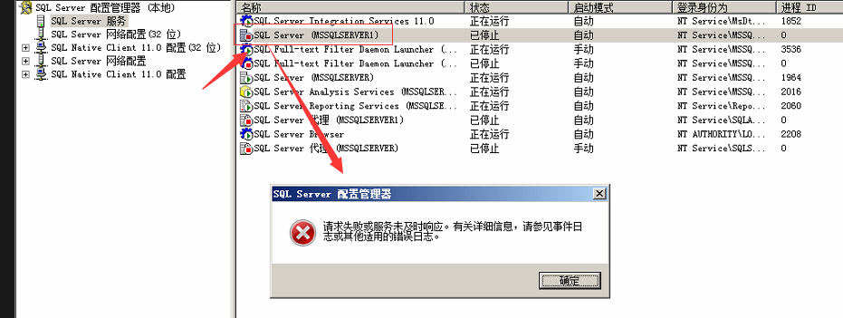 问题描述:网站无法打开,是数据库的服务没有开启导致的。开启SQL的服务失败,报错如下图,