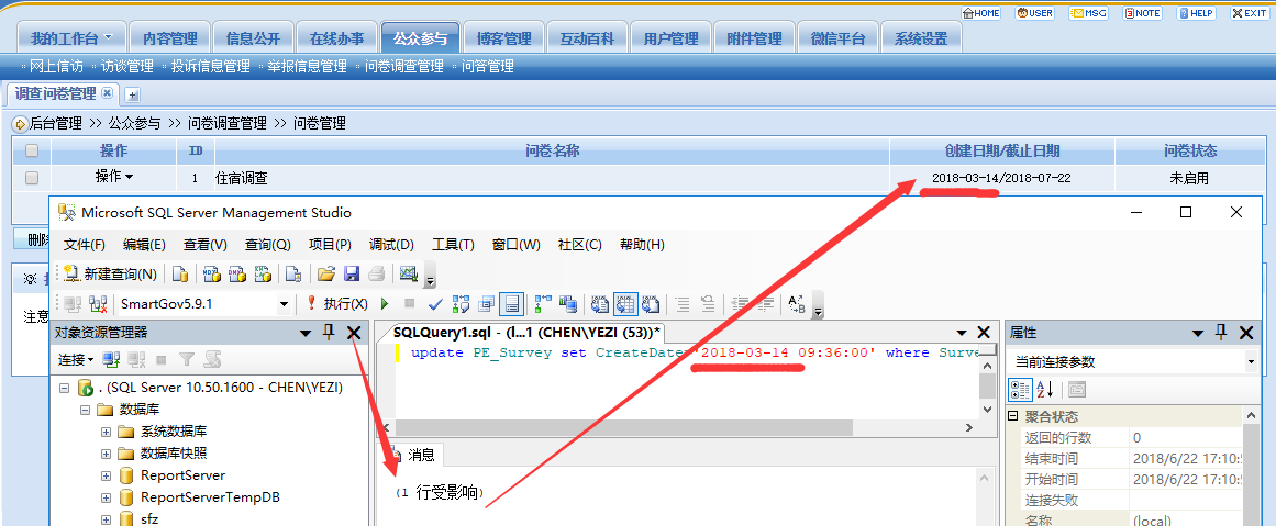 在数据库执行完SQL语句update PE_Survey set CreateDate='2018-03-14 09:36:00' where SurveyID=1之后,刷新页面,看到已经修改好了。