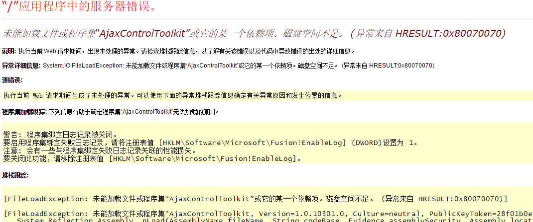 问题:网站运行时间上出现以下错误:异常来自HRESULT:0X80070070 解决方法: 1.检查磁盘容量; 2.检查程序权限。