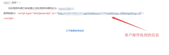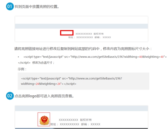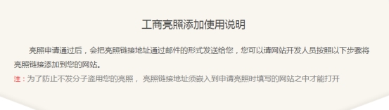 <p align="center"><img alt="" border="0" height="157" src="$/History/tech/uploadfiles/2018/9/201809051034151216.jpg" width="553" /></p> <p align="center"><img alt="" border="0" height="425" src="$/History/tech/uploadfiles/2018/9/201809051034156355.jpg" width="554" /></p> <p style="text-indent: 2em">亮照的添加步骤,这里最为需要注意的是这个地址。并不是将客户的域名更换然后插入首页模板,这里的代码是工商局通过邮件发送给客户的,要问客户给,不然添加就会出错。</p> <p align="center"><img alt="" border="0" height="182" src="$/History/tech/uploadfiles/2018/9/201809051034151579.jpg" width="553" /></p> <p align="center"><img alt="" border="0" height="134" src="$/History/tech/uploadfiles/2018/9/201809051034150862.jpg" width="554" /></p> <p style="text-indent: 2em">添加后效果:</p> <p align="center"><img alt="" border="0" height="110" src="$/History/tech/uploadfiles/2018/9/201809051034157245.jpg" width="553" /></p>