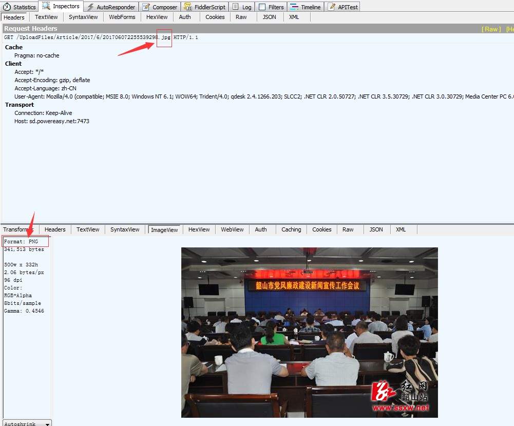 继续Fiddler检查,发现请求的图片扩展名是jpg的,但是图片格式png的,所以加上属性之后就无法访问。