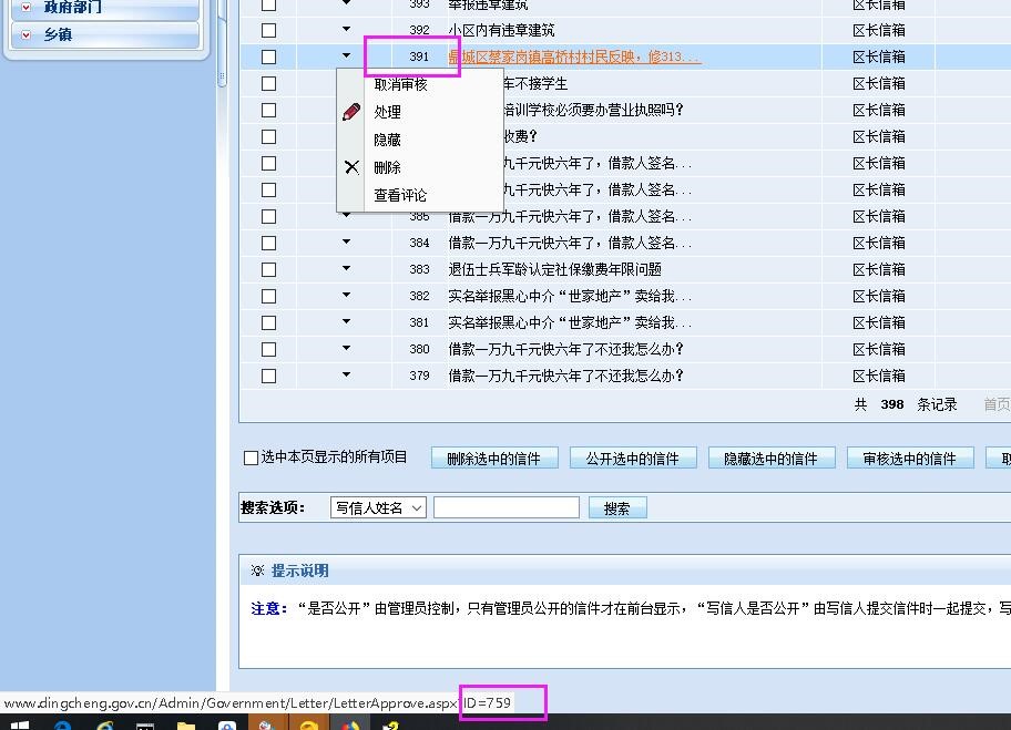 打开数据库,通过信件ID查询PE_GV_LetterHistory表,此时需要注意的是LetterId和后台看到的ID不一致,需要将鼠标移到到信件上面,然后看浏览器的左下角地址栏显示的ID数(例:查询759)
