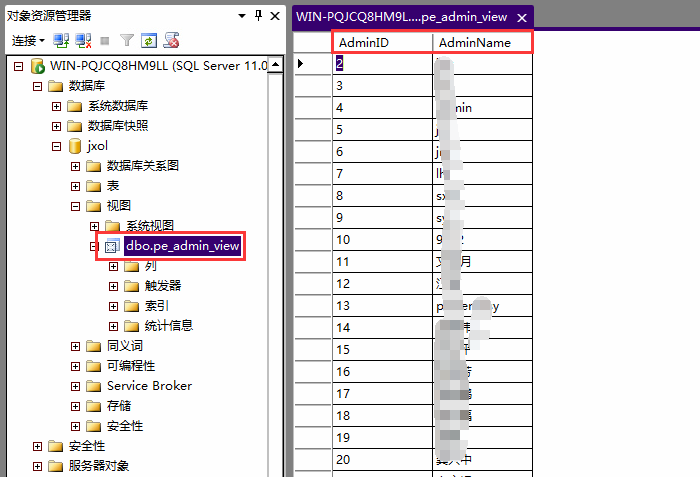 问题解决:针对PE_Admin表必要字段创建视图,对视图进行查询。