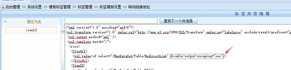 转向连接跳转异常处理 来源:本站原创 点击数: 次 发布时间:2019年01月02日 问题描述: 添加转向连接后,前台访问异常,&被转义成& 解决方法: 搜索“转向链接地址标签”,如图添加disable-output-escaping="yes"