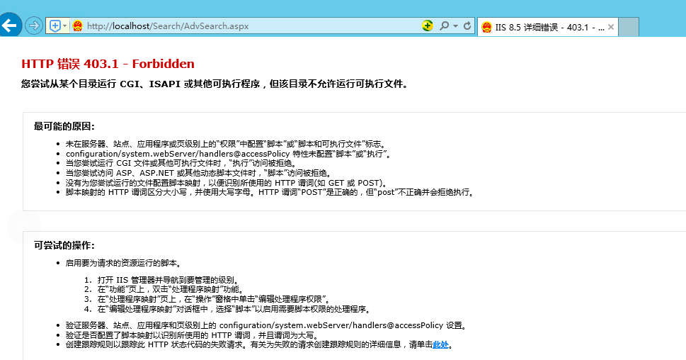 全文检索访问出现错误,具体报错:HTTP错误403.1-Forbidden 您尝试从某个目录运行CGI、ISAPI或其他可执行程序,但该目录不允许运行可执行文件