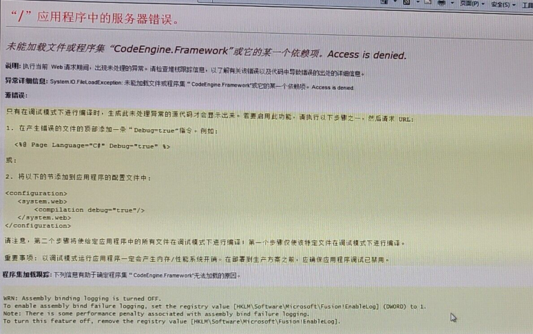 问题描述:网站突然报错——未能加载文件或程序集“CodeEngine.Framework”或它的某一个依赖项。Access is denied