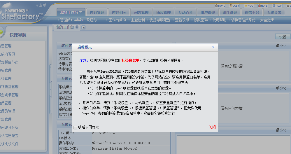 1. 如果没有启用标签白名单,进入后台后会有如下提示: