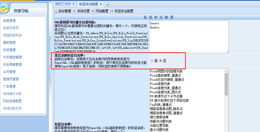 2. 可点击上图的红色字“标签白名单”进入“标签安全配置”中启用标签白名单: