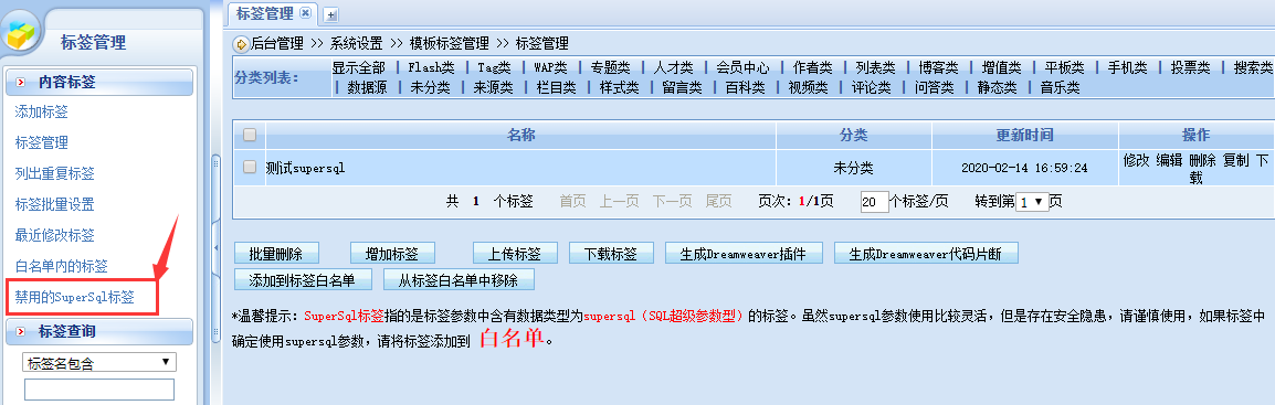 3. 进入后台管理 >> 系统设置 >> 模板标签管理 >> 标签管理,点击“禁用的SuperSql标签”: