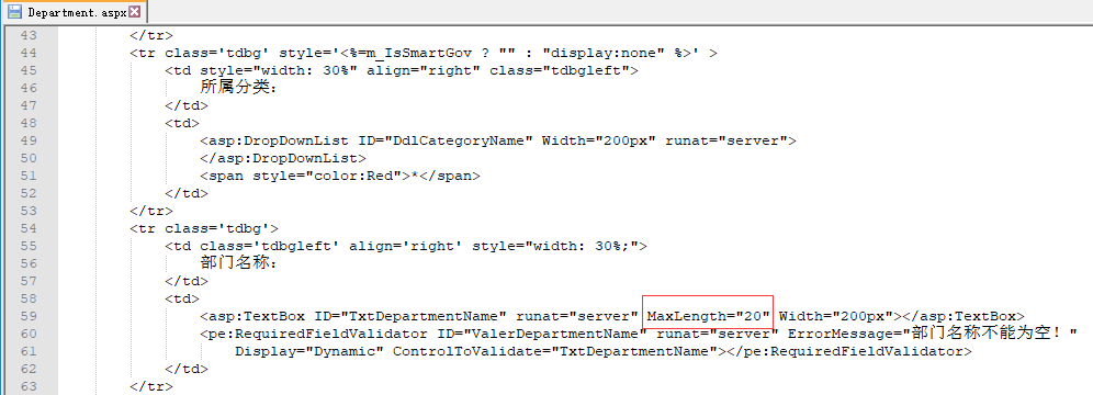 <p style="line-height: 150%"><strong>问题描述:</strong>SmartGov系统添加部门时,部门名称字数被限制。</p> <p style="line-height: 150%"><img src="$/History/tech/uploadfiles/help/2019/6/201906032101072061.png" style="height: 281px; width: 800px" /></p> <p style="line-height: 150%"><img src="$/History/tech/uploadfiles/help/2019/6/201906032101078948.png" style="height: 340px; width: 800px" /></p> <p style="line-height: 150%"><strong>解决方案:</strong>修改AdminUser Department.aspx文件。</p> <p style="line-height: 150%">将MaxLength的值改大一点即可。</p> <p style="line-height: 150%"><img src="$/History/tech/uploadfiles/help/2019/6/201906032101078375.png" style="height: 289px; width: 800px" /></p> <p style="line-height: 150%"> </p>