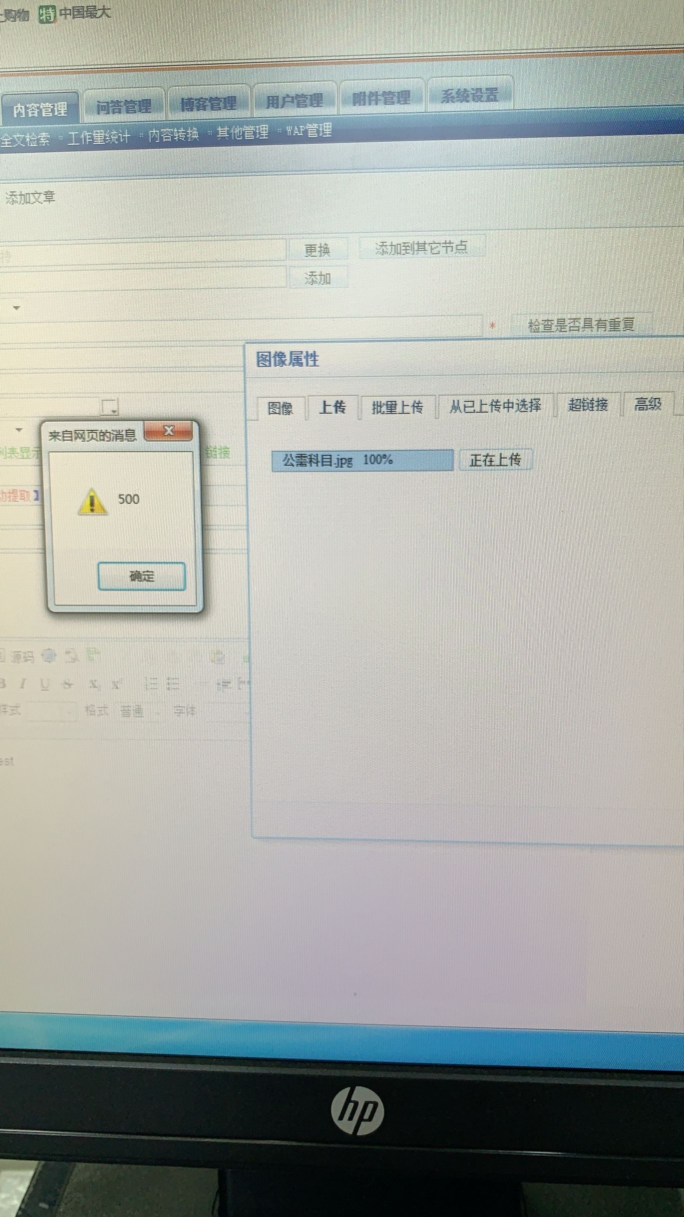问题描述:在ss中发表文章时,在上传文件时报500提示错误,并且在上传进度中一直显示正在上传 原因:这种问题就是upload上传文件夹权限不够,给它写入数据的权限。