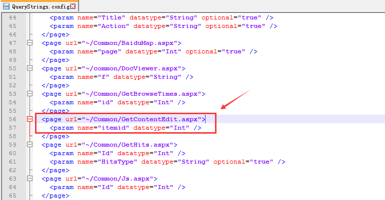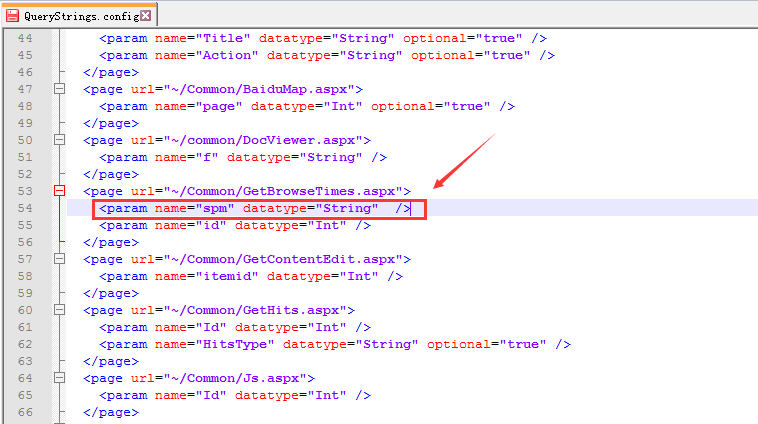 分析地址里的参数分别是spm,itemId,然后查看参数定义,打开网站程序文件,编辑Config/QueryStrings,找到相应位置,发现spm参数未定义。