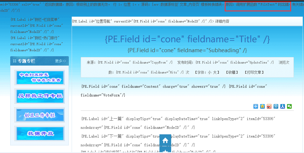 首先检查服务器,日期格式是否正常,时间是否为标准东八区,语言格式是否为中文简体。.net版本问题,这个问题现在已经很少了,毕竟没几个不要命的还坚持用2003操作系统了。2003操作系统里,.net需要另外安装,如果只是装了.net2.0,没有打sp2补丁,会有标签无法解析的情况。数据源标签、内容页模板问题,比如说,如果所有文章模型的内容都报错,极有可能“文章_内容页”标签或文章内容页模板本身出问题了,这个相对好排查,拿产品默认的盖上去试下是否正常。如果是有详细的错误信息,可可以具体问题具体分析,如下图:模板转换错误,原因:调用扩展函数“FiltText”时出错