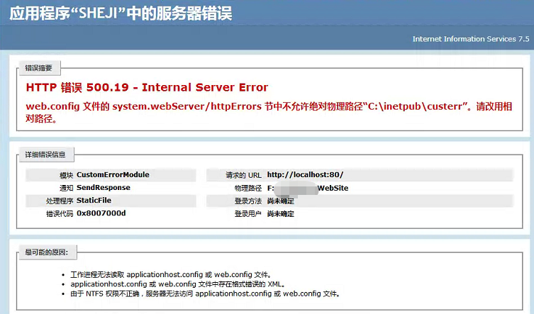暂时屏蔽一下web.config文件里面的httpErrors节,屏蔽之后,刷新页面,看清具体的错误,再做下一步分析。