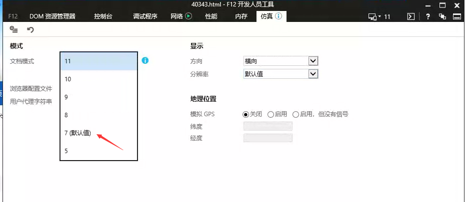IE11打开网站,F12仿真模式中的文档模式默认为IE7