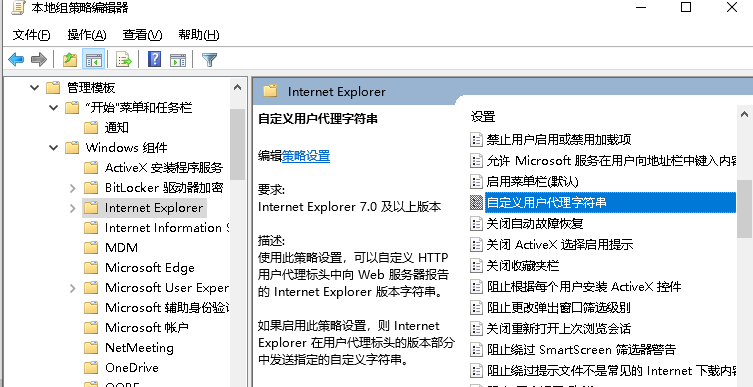 先cmd运行gpedit.msc打开组策略,计算机配置--管理模板--Windows组件--Internet Explorer下面找到“自定义用户代理字符串”,打开看看里面是否有填写IE版本